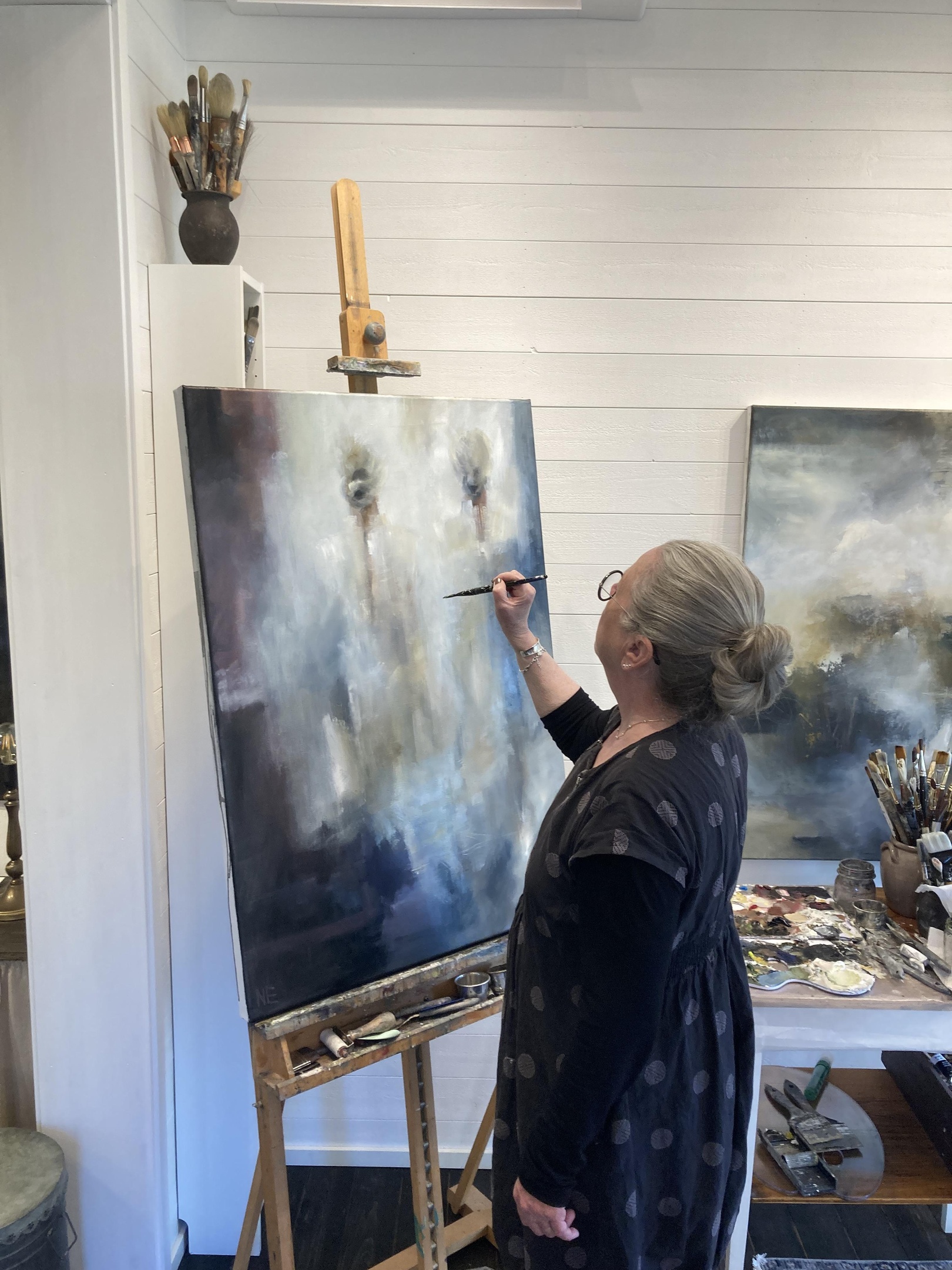arbetar i är olja, akryl, akvarell, kol, krita och collage.