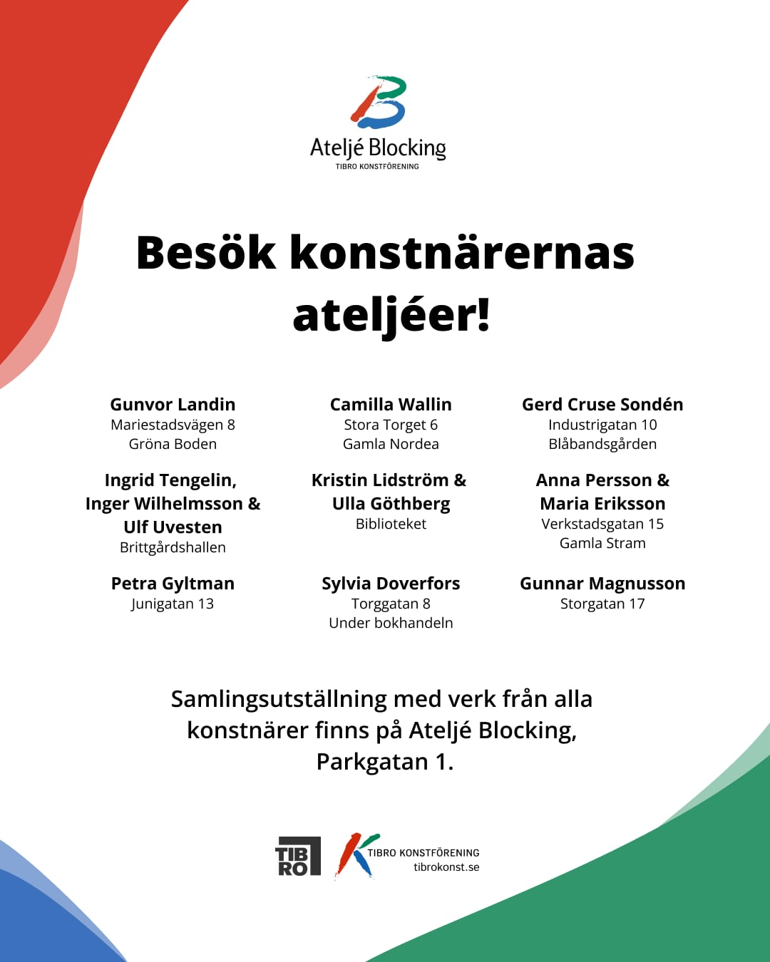 Den 18-19 april är det dags för konstvandring i Tibro. Välkommen att hämta ut ett startkort med karta på Ateljé Blocking eller på någon av ateljéerna i Tibro. För att vara med i konstlotteriet behöver du besöka alla utställare och få signaturer, betala 25kr per startkort eller 5st startkort för 100kr och lämna in på Ateljé Blocking. Startkortet omvandlas då till en lott och du har chans att vinna konst från de utställande konstnärerna. Läs mer om konstvandringen och de utställande konstnärerna här.